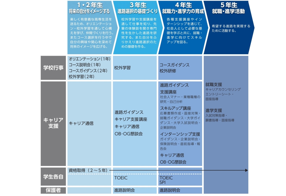 本校では、学生1人ひとりがキャリアをデザインし、希望の進路選択を行うことができるように低学年から様々な行事や講座を含むプログラムを提供しています。また、下記の行事や講座以外にも、女子学生向けに女性技術者としてのキャリアを考える機会としてキャリア支援講座を開講しています。5年間を通して専門性と人間力を培うことで、毎年ほぼ100%の進路内定率を達成しています。
