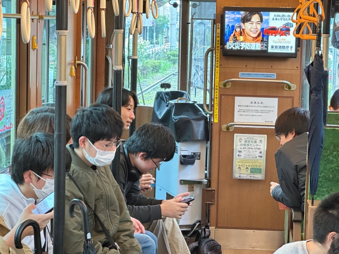 2025年11月9日(日)、荒川キャンパス鉄道ジオラマ部が都電荒川線の貸切乗車会を行いました。都電荒川線は荒川区の三ノ輪橋停留所から新宿区の早稲田停留所を結ぶ都内に残る唯一の路面電車で、東京さくらトラムの愛称で知られています。貸切運転は三ノ輪橋から早稲田を1往復し、鉄道ジオラマ部の部員および路面電車に興味のある学生が参加しました。各自思い思いに車窓を眺めたり、写真を撮ったり、モーター音を楽しんだりと楽しい2時間を過ごしていました。また、現在唯一の道路併用区間である、王子-飛鳥山間では、自動車との距離の近さなどを体験し、地方都市活性化の一助となる可能性があるライトレール推進の是非なども学生間で議論を交わしていました。