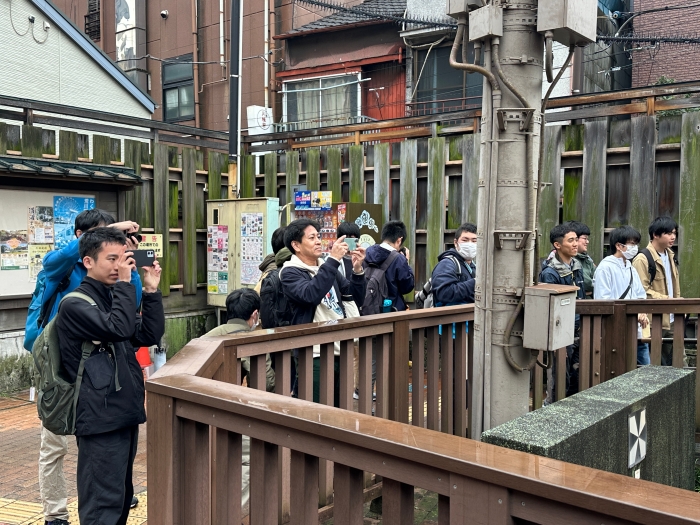○三ノ輪橋停留所にて乗車電車の到着に一斉にカメラを向ける学生たち