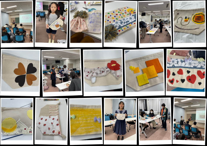 岡瀬先生からのコメント:お弁当袋というベースに限られた材料の中での制作でしたが、ご参加の皆さんの作品は一つも似通うものはなく、それぞれの個性が光る作品となっていました。手を動かすことで新たなアイデアが生まれることも体験されたかと思います。今回のワークショップはアップサイクリングをキーワードに行いましたが、これからの皆様の活動の中で、エシカルな視点を取り入れていただくきっかけになれば嬉しいです。