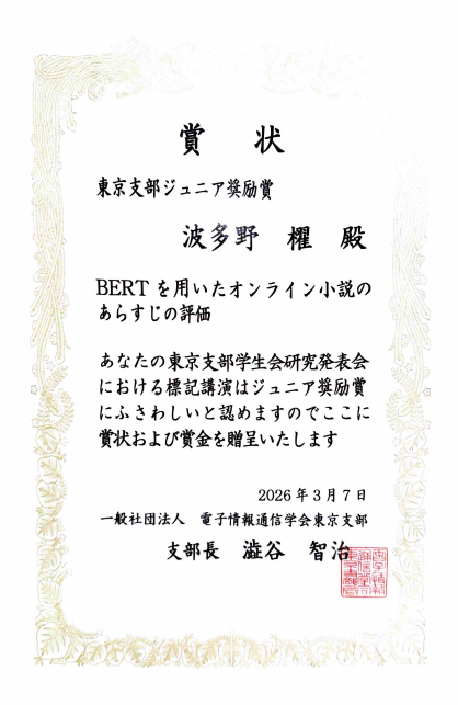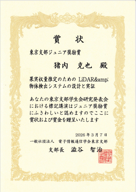 第31回電子情報通信学会 東京支部学生会研究発表会において、情報通信工学コース、情報システム工学コースの学生がジュニア奨励賞を受賞!