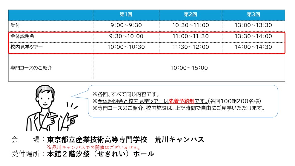 ※会場は荒川キャンパスですが、全体説明会とコース紹介ブースでは品川の紹介も行います。